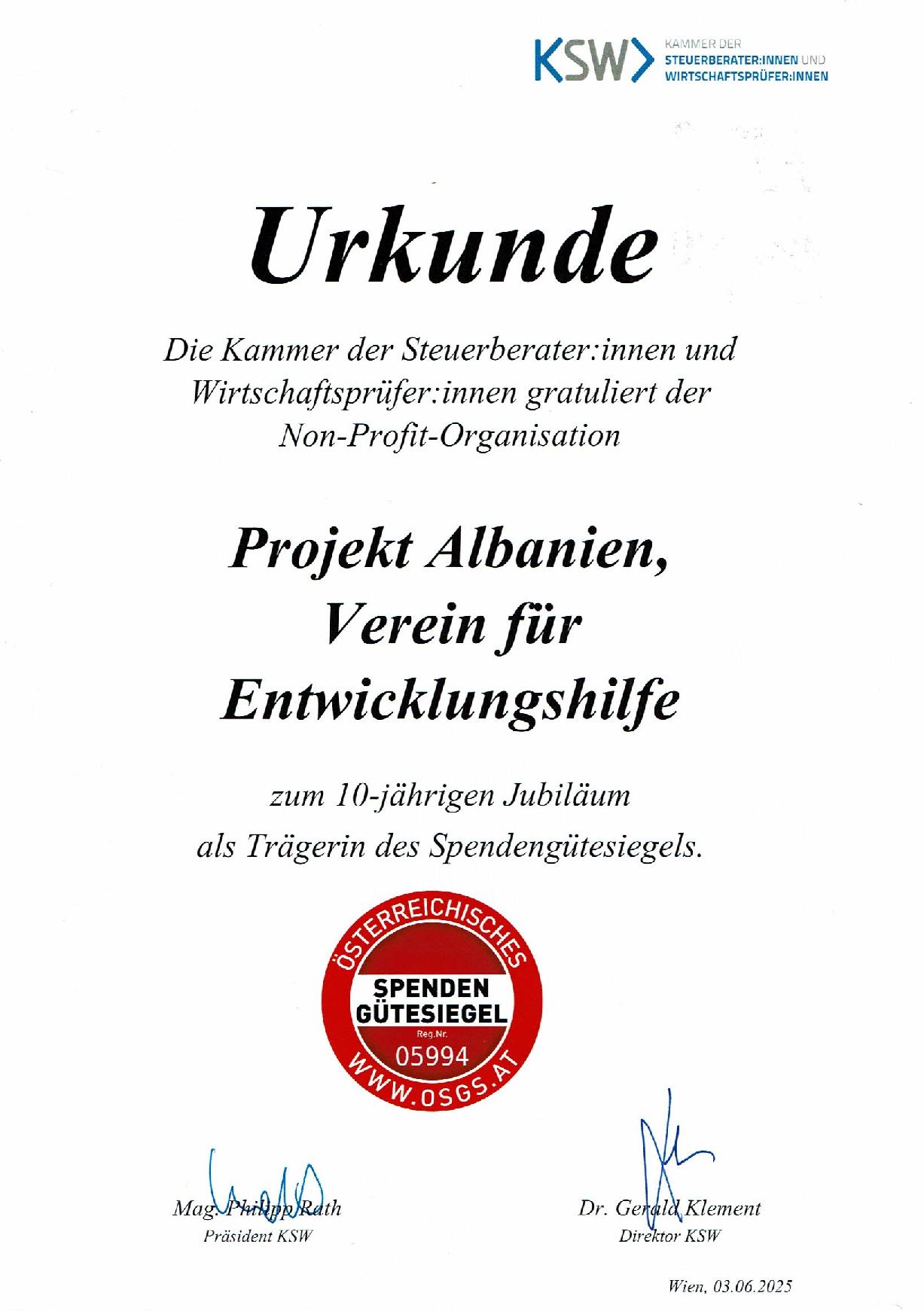 Wir freuen uns sehr, dass unser Verein vom OSGS Forum für 10 Jahre durchgehendes Spendengütesiegel ausgezeichnet wurde. Diese Anerkennung bedeutet uns viel – denn sie bestätigt unseren konsequenten Einsatz für Transparenz, Verantwortung und Effizienz im Umgang mit Spendengeldern.
